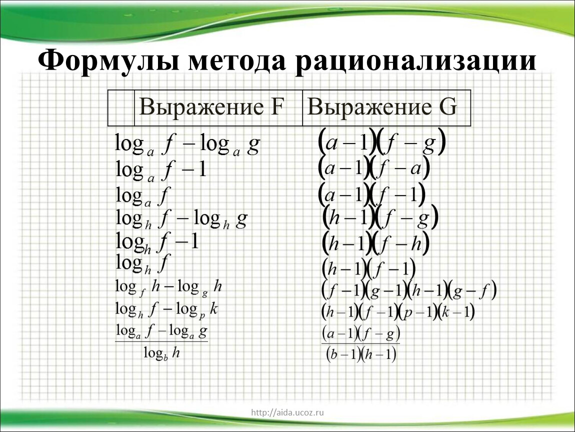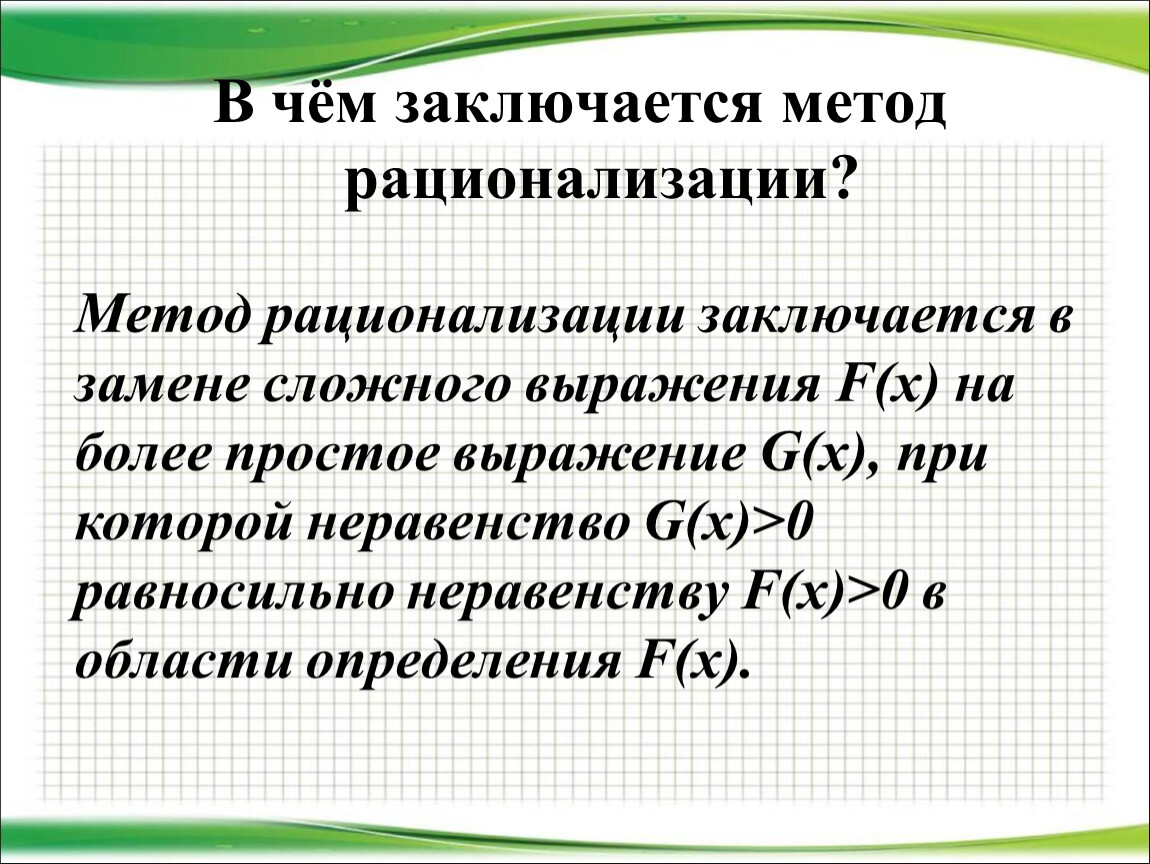 Метод рационализации заключается в замене сложного выражения F(x) на более простое выражение G(x), при которой неравенство G(x)>0 равносильно неравенству F(x)>0 в области определения F(x).