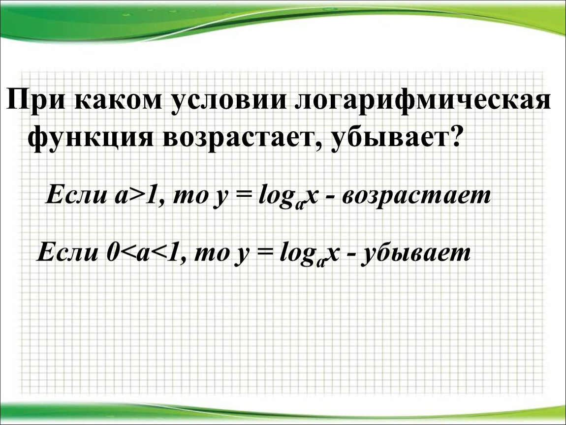 При каком условии логарифмическая функция возрастает, убывает?