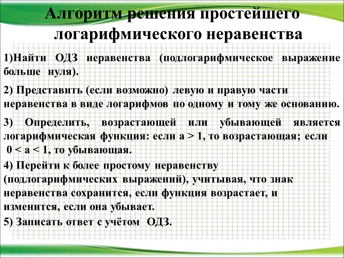 4) Перейти к более простому неравенству (подлогарифмических выражений), учитывая, что знак неравенства сохранится, если функция возрастает, и изменится, если она убывает.