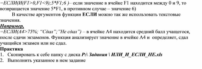 =ЕСЛИ(И(F1>0,F1<9);5*F1;6 )– если значение в ячейке F1 находится между 0 и 9, то возвращается значение 5*F1, в противном случае – значение 6)