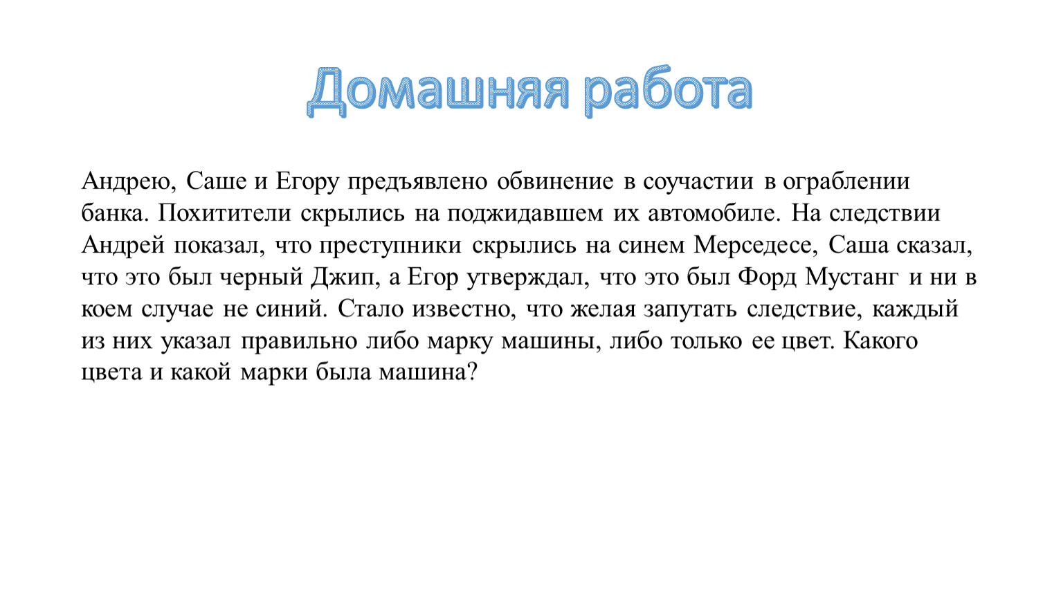 Андрею, Саше и Егору предъявлено обвинение в соучастии в ограблении банка. Похитители скрылись на поджидавшем их автомобиле. На следствии Андрей показал, что преступники скрылись на синем Мерседесе, Саша сказал, что это был черный Джип, а Егор утверждал, что это был Форд Мустанг и ни в коем случае не синий. Стало известно, что желая запутать следствие, каждый из них указал правильно либо марку машины, либо только ее цвет. Какого цвета и какой марки была машина?