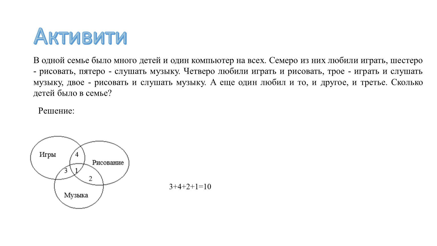 В одной семье было много детей и один компьютер на всех. Семеро из них любили играть, шестеро - рисовать, пятеро - слушать музыку. Четверо любили играть и рисовать, трое - играть и слушать музыку, двое - рисовать и слушать музыку. А еще один любил и то, и другое, и третье. Сколько детей было в семье?