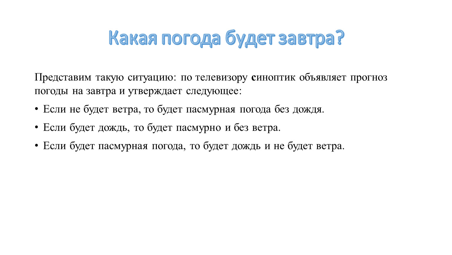 Если будет пасмурная погода, то будет дождь и не будет ветра.