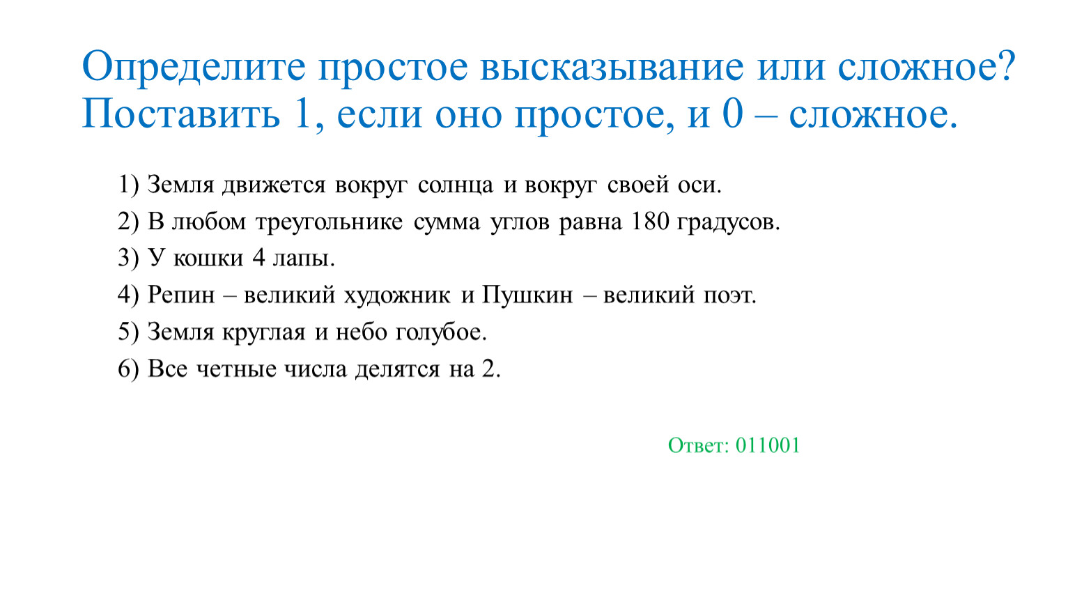 Определите простое высказывание или сложное? Поставить 1, если оно простое, и 0 – сложное.