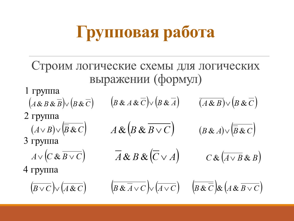 Групповая работаСтроим логические схемы для логических выражении (формул)
