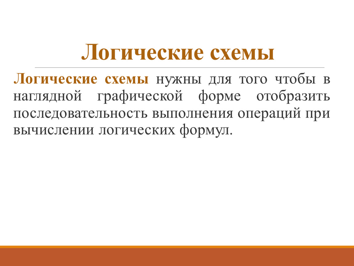 Логические схемы нужны для того чтобы в наглядной графической форме отобразить последовательность выполнения операций при вычислении логических формул.
