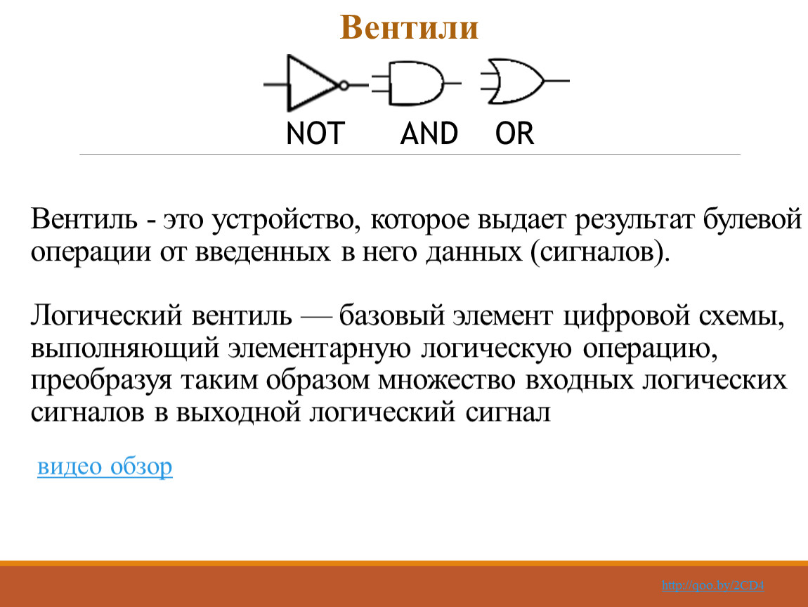 Вентиль - это устройство, которое выдает результат булевой операции от введенных в него данных (сигналов).Логический вентиль — базовый элемент цифровой схемы, выполняющий элементарную логическую операцию, преобразуя таким образом множество входных логических сигналов в выходной логический сигнал