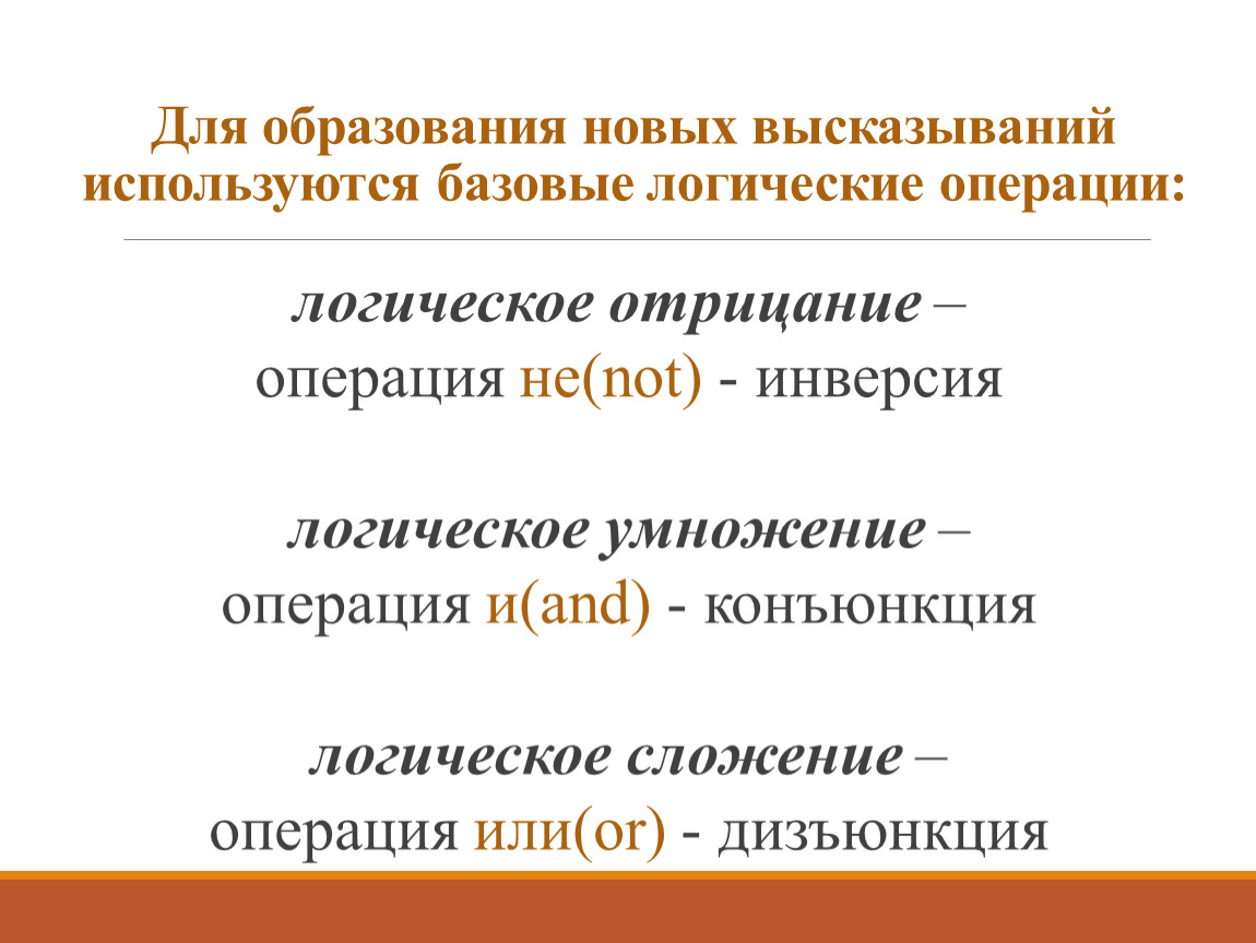 Для образования новых высказываний используются базовые логические операции: