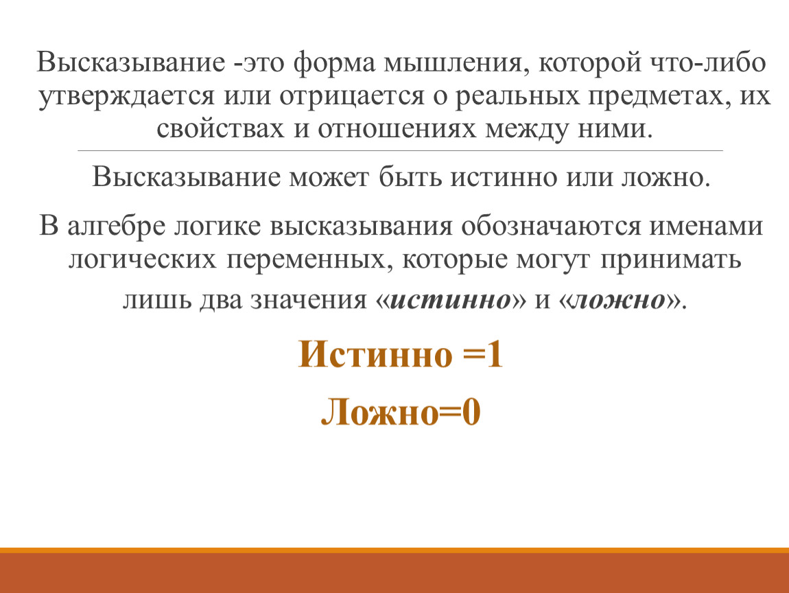 Высказывание -это форма мышления, которой что-либо утверждается или отрицается о реальных предметах, их свойствах и отношениях между ними.