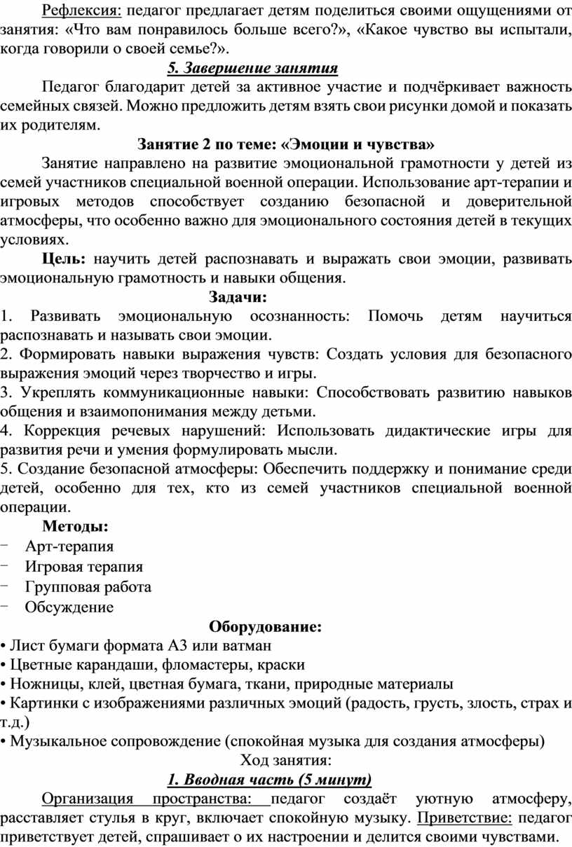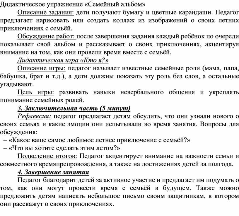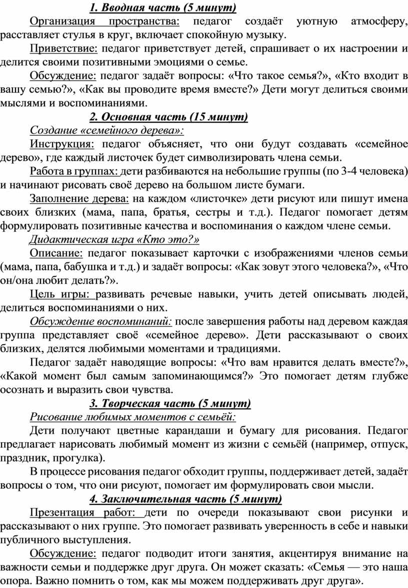 Рефлексия: педагог предлагает детям обсудить, что они узнали нового о своих семьях и какие эмоции они испытывали во время занятия. Вопросы для обсуждения: