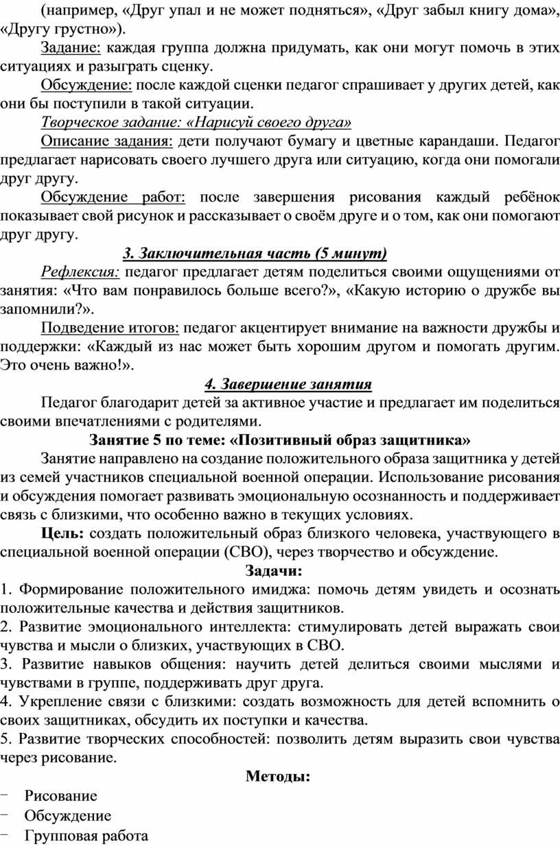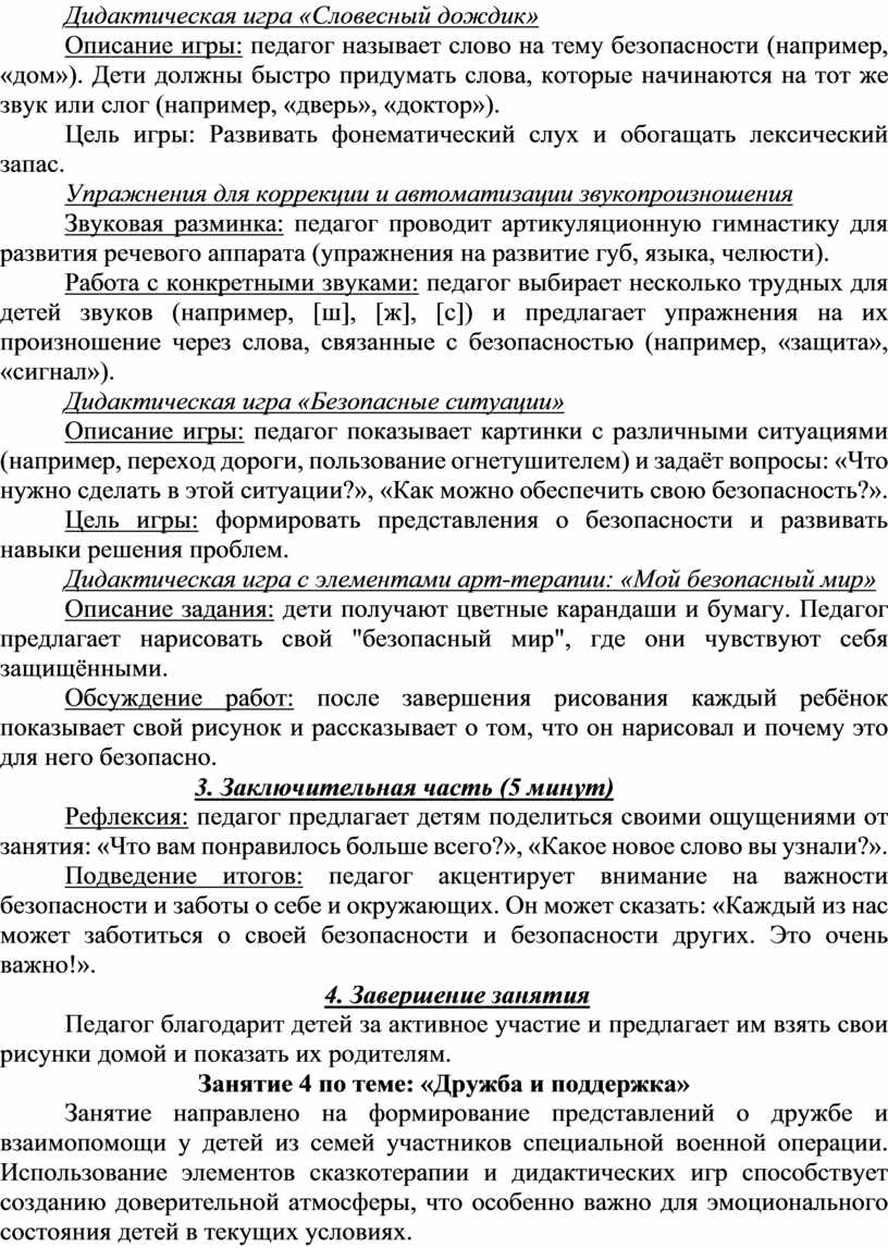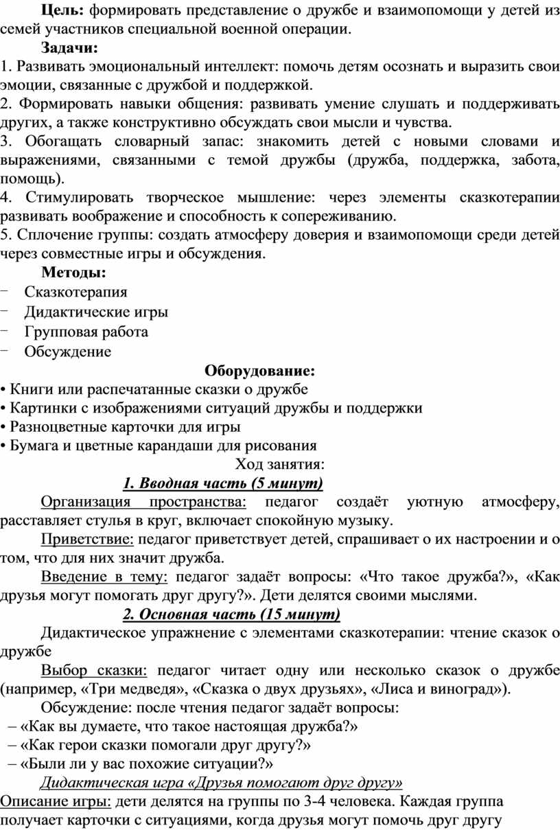 Занятие направлено на формирование представлений о дружбе и взаимопомощи у детей из семей участников специальной военной операции. Использование элементов сказкотерапии и дидактических игр способствует созданию доверительной атмосферы, что особенно важно для эмоционального состояния детей в текущих условиях.