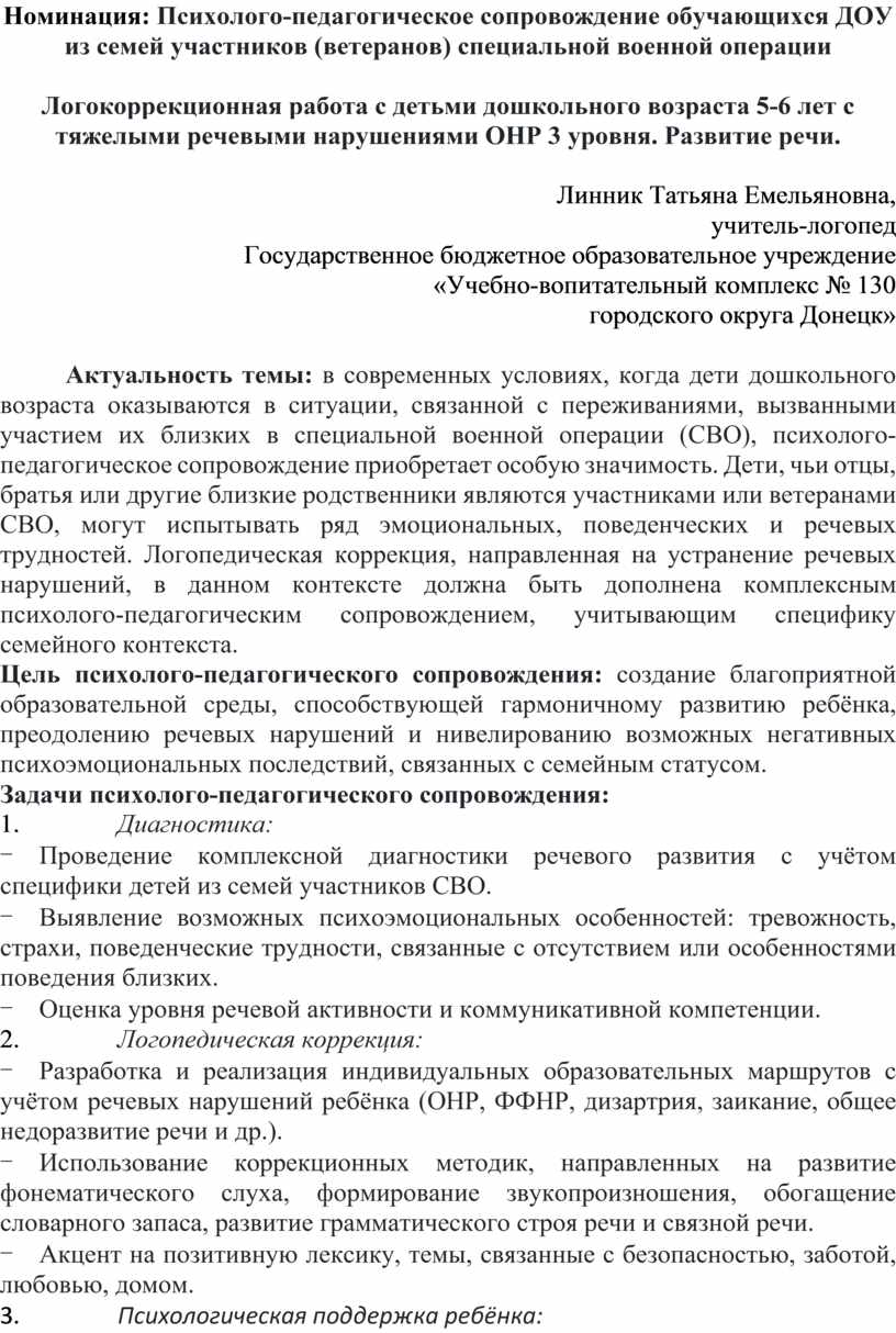 Актуальность темы: в современных условиях, когда дети дошкольного возраста оказываются в ситуации, связанной с переживаниями, вызванными участием их близких в специальной военной операции (СВО), психолого-педагогическое сопровождение приобретает особую значимость. Дети, чьи отцы, братья или другие близкие родственники являются участниками или ветеранами СВО, могут испытывать ряд эмоциональных, поведенческих и речевых трудностей. Логопедическая коррекция, направленная на устранение речевых нарушений, в данном контексте должна быть дополнена комплексным психолого-педагогическим сопровождением, учитывающим специфику семейного контекста.