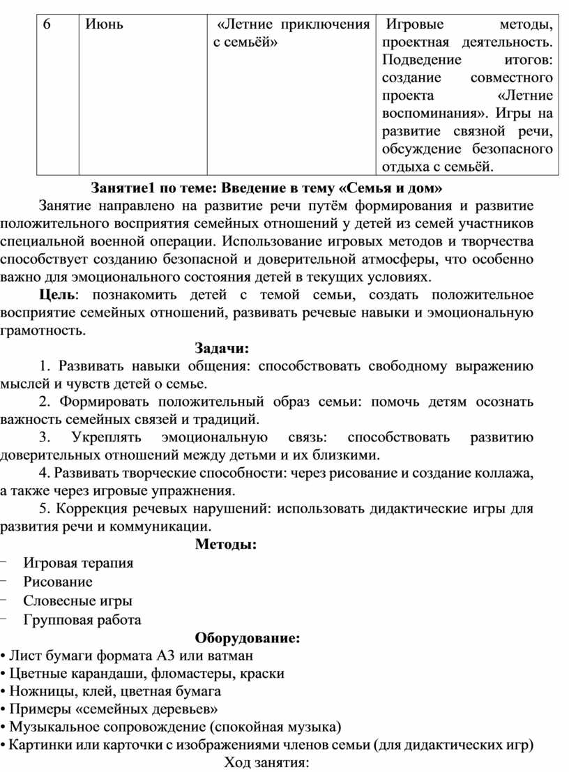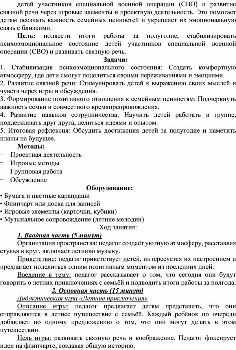 Занятие «Летние приключения с семьёй» направлено на подведение итогов работы за полугодие, стабилизацию психоэмоционального состояния детей участников специальной военной операции (СВО) и развитие связной речи через игровые элементы и проектную деятельность. Это помогает детям осознать важность семейных ценностей и укрепляет их эмоциональную связь с близкими.