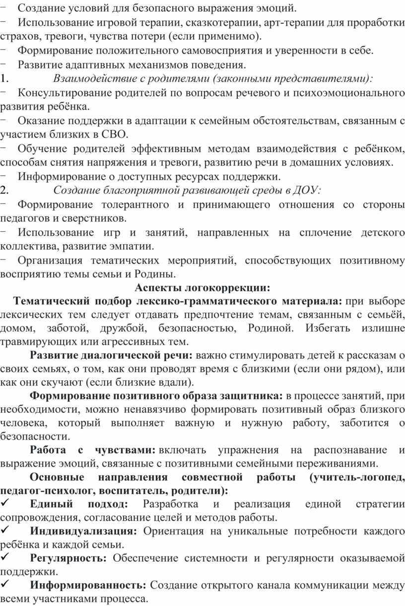 Заключение: психолого-педагогическое сопровождение обучающихся ДОУ из семей участников (ветеранов) СВО в условиях логокоррекции требует комплексного, чуткого и индивидуализированного подхода. Важно создать атмосферу доверия, безопасности и поддержки, чтобы помочь детям преодолеть трудности и обеспечить их полноценное развитие.