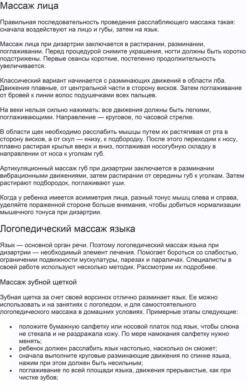 Логопедический массаж при разных формах дизартрии предполагает механическое воздействие на различные участки лица и на язык. В итоге устраняется патологическая симптоматика в периферическом отделе речевого аппарата, меняется тонус мышц.