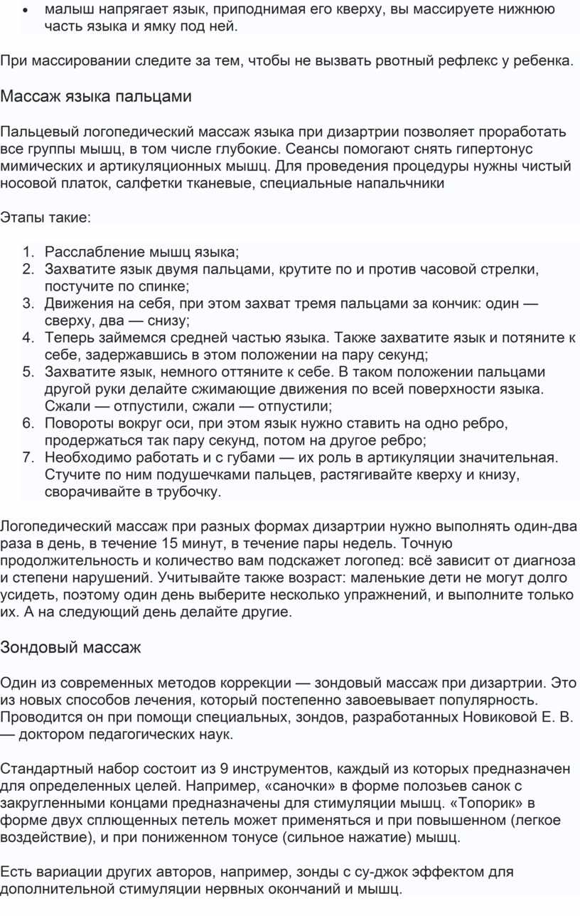 Один из современных методов коррекции — зондовый массаж при дизартрии. Это из новых способов лечения, который постепенно завоевывает популярность. Проводится он при помощи специальных, зондов, разработанных Новиковой Е. В. — доктором педагогических наук.