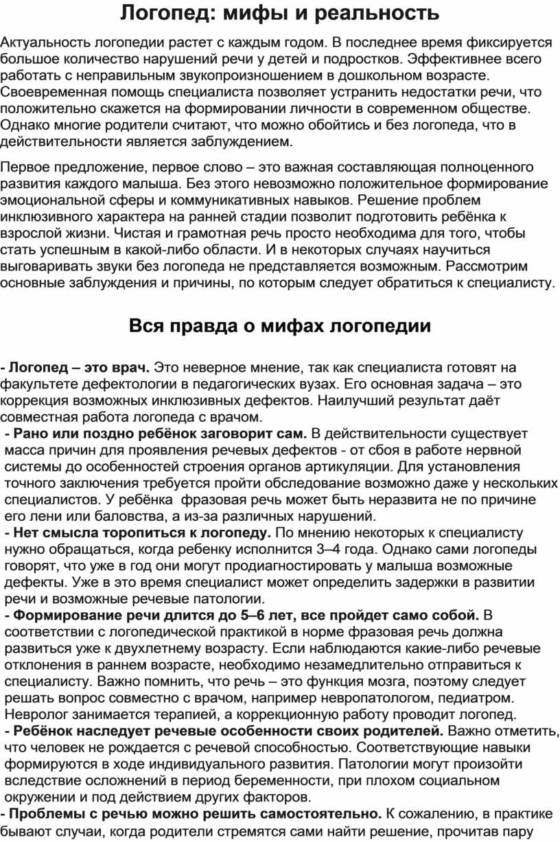- Логопед – это врач. Это неверное мнение, так как специалиста готовят на факультете дефектологии в педагогических вузах. Его основная задача – это коррекция возможных инклюзивных дефектов. Наилучший результат даёт совместная работа логопеда с врачом.