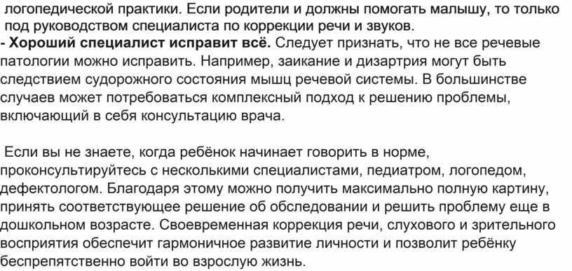 - Хороший специалист исправит всё. Следует признать, что не все речевые патологии можно исправить. Например, заикание и дизартрия могут быть следствием судорожного состояния мышц речевой системы. В большинстве случаев может потребоваться комплексный подход к решению проблемы, включающий в себя консультацию врача.