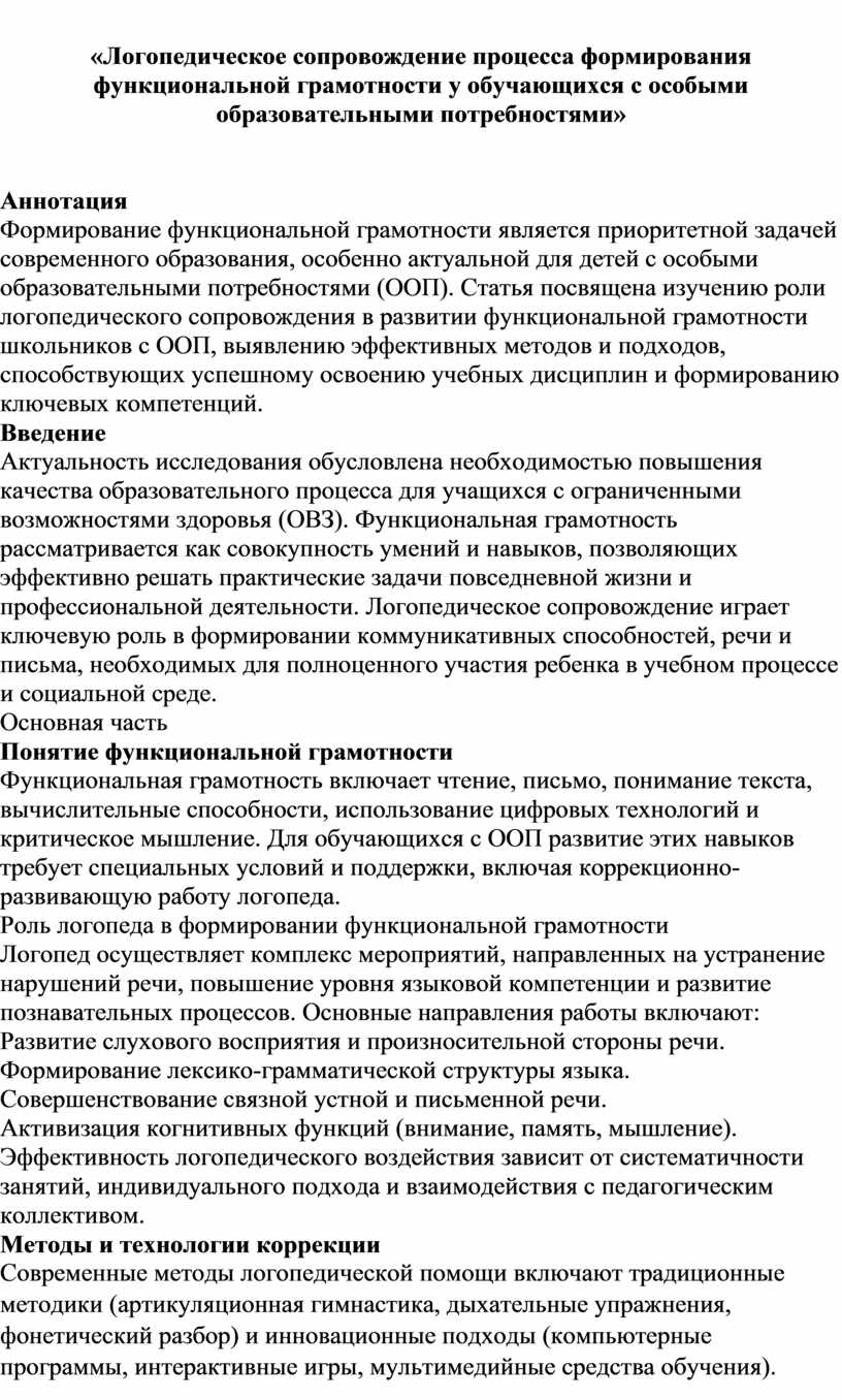 Таким образом, логопедическое сопровождение является необходимым компонентом образовательной среды для обучающихся с особыми образовательными потребностями. Оно обеспечивает условия для успешного освоения учебного материала, интеграции в общество и достижения высокого уровня функциональной грамотности. Дальнейшие исследования должны быть направлены на разработку новых методик и внедрение передовых технологий в практику коррекционного обучения.