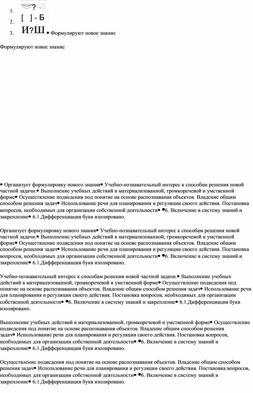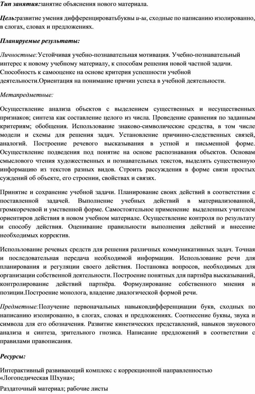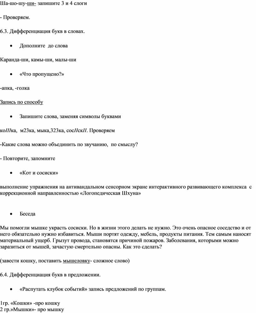 6.1.Дифференциация букв изолировано. 6.1.1. Конструирование букв 6.1.2. «Что пропущено?» выполнение задания с применением интерактивного развивающего комплекса с коррекционной направленностью «Логопедическая Шхуна» - Допишите недостающие элементы букв И-Шна столе песочной анимации 1гр. «Кошки» -элементы буквы И 2 гр. «Мышки»- элементы буквы Ш 6.1.3. Продолжи строку букв .Задание на рабочем листе. и ш и ш ш и ________________________ 6.2. Дифференциация букв в слогах · «Паутинка» и с а ш и а . . . . - Назовите слоги. Правило 1: сколько в слове гласных-столько и слогов. Правило 2: ЖИ –ШИ пиши с буквой И. - Произнесите слог ШИ в соответствии с ритмическим рисунком. 2-1-2 (стук) - Выполните ритмический рисунок 1-2-1 (хлопок) · «Будь внимательным смотри, без ошибки повтори» Выборочный диктант Ти-ки–ли–запишите 2-ой слог Ша-шо-шу-ши- запишите 3 и 4 слоги - Проверяем. 6.3. Дифференциация букв в словах. · Дополните до слова Каранда-ши, камы-ши, малы-ши · «Что пропущено?» -апка, -голка Запись по способу · Запишите слова, заменяя символы буквами коIIIка, м23ка, мыка,323ка, сосIIскII. Проверяем -Какие слова можно объединить по звучанию, по смыслу? - Повторите, запомните · «Кот и сосиски» выполнение упражнения на антивандальном сенсорном экране интерактивного развивающего комплекса с коррекционной направленностью «Логопедическая Шхуна»