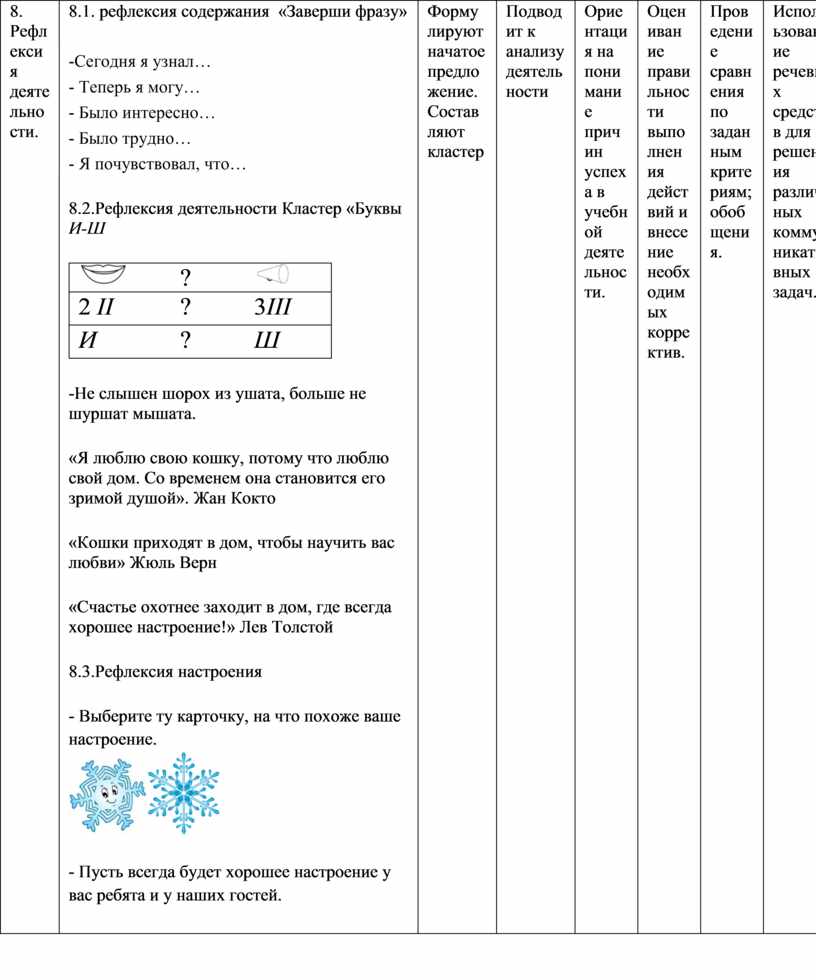 8.1. рефлексия содержания «Заверши фразу» 1. -Сегодня я узнал… 2. - Теперь я могу… 3. - Было интересно… 4. - Было трудно… 5. - Я почувствовал, что… 8.2.Рефлексия деятельности Кластер «Буквы И-Ш