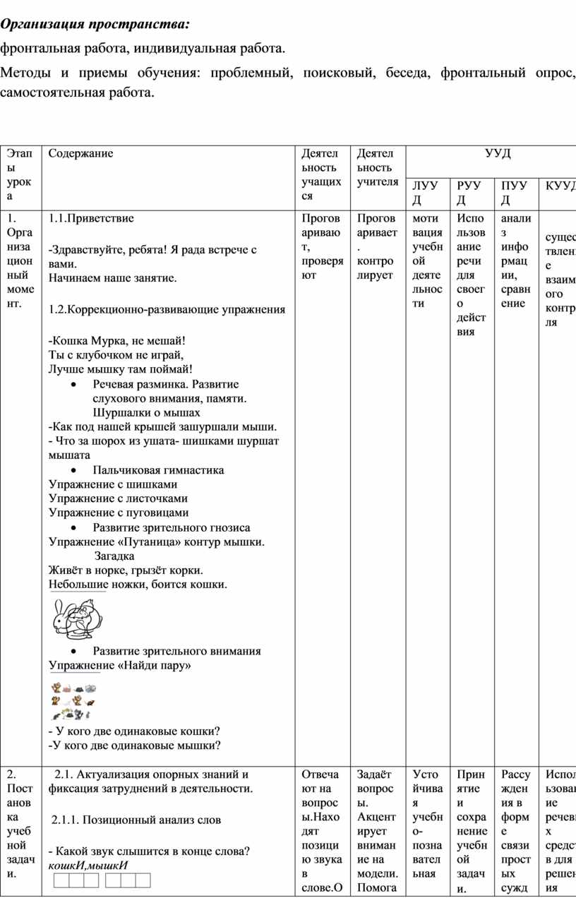 1.1.Приветствие -Здравствуйте, ребята! Я рада встрече с вами. Начинаем наше занятие. 1.2.Коррекционно-развивающие упражнения -Кошка Мурка, не мешай! Ты с клубочком не играй, Лучше мышку там поймай! · Речевая разминка. Развитие слухового внимания, памяти. Шуршалки о мышах -Как под нашей крышей зашуршали мыши. - Что за шорох из ушата- шишками шуршат мышата · Пальчиковая гимнастика Упражнение с шишками Упражнение с листочками Упражнение с пуговицами · Развитие зрительного гнозиса Упражнение «Путаница» контур мышки. Загадка Живёт в норке, грызёт корки. Небольшие ножки, боится кошки.
