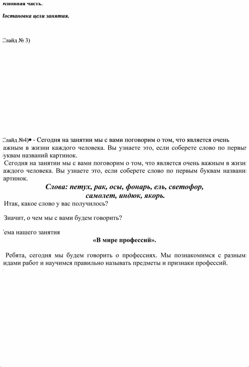 - Сегодня на занятии мы с вами поговорим о том, что является очень важным в жизни каждого человека. Вы узнаете это, если соберете слово по первым буквам названий картинок. Слова: петух, рак, осы, фонарь, ель, светофор, самолет, индюк, якорь. - Итак, какое слово у вас получилось? - Значит, о чем мы с вами будем говорить? Тема нашего занятия «В мире профессий».