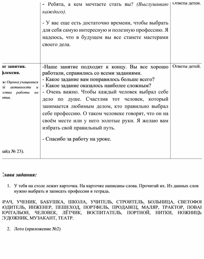-Наше занятие подходит к концу. Вы все хорошо работали, справились со всеми заданиями. - Какое задание вам понравилось больше всего? - Какое задание оказалось наиболее сложным? - Очень важно. Чтобы каждый человек выбрал себе дело по душе. Счастлив тот человек, который занимается любимым делом, кто правильно выбрал себе профессию. О таком человеке говорят, что он на своём месте или у него золотые руки. Я желаю вам избрать свой правильный путь. - Спасибо за работу на уроке.