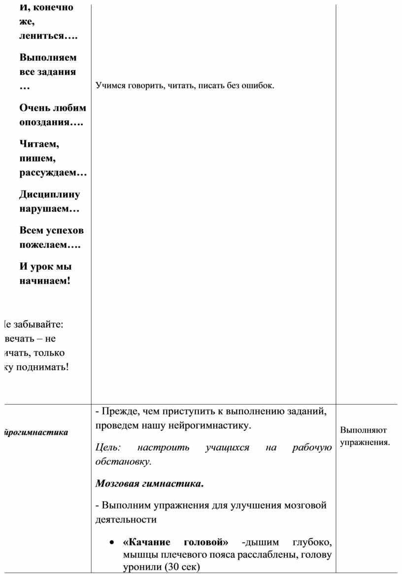 - Прежде, чем приступить к выполнению заданий, проведем нашу нейрогимнастику. Цель: настроить учащихся на рабочую обстановку. Мозговая гимнастика. - Выполним упражнения для улучшения мозговой деятельности · «Качание головой» -дышим глубоко, мышцы плечевого пояса расслаблены, голову уронили (30 сек) · «Ленивые восьмерки» выполняем в горизонтальной плоскости сначала правой рукой, левой и обеими руками по 3раза. · «Письмо носом» напишите своё имя носом. 1. 2. Нейрогимнастика . · «Один – два» правой рукой показать указательный палец, одновременно левой рукой указательный и средний пальцы. Потом одновременно их поменять. · «Колечко – кулак» · «Ухо – нос». Левой рукой взять кончик носа, правой рукой – за противоположное ухо. Одновременно отпустить ухо и нос, хлопнуть в ладоши, поменять положение рук «с точностью до наоборот». · Массаж рук с помощью массажных шариков Су-Джок по направляющим линиям. Нейроартикуляционная гимнастика. • «Толстячки-худышки» • «Заборчик-хоботок» • «Часики» • «Качели» • «Маляр» • «Лошадка» • «Барабан»