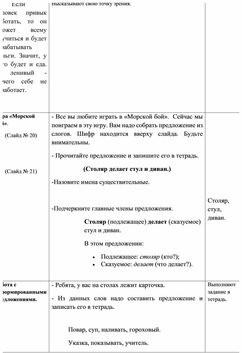- Все вы любите играть в «Морской бой». Сейчас мы поиграем в эту игру. Вам надо собрать предложение из слогов. Шифр находится вверху слайда. Будьте внимательны. - Прочитайте предложение и запишите его в тетрадь. (Столяр делает стул и диван.) -Назовите имена существительные.