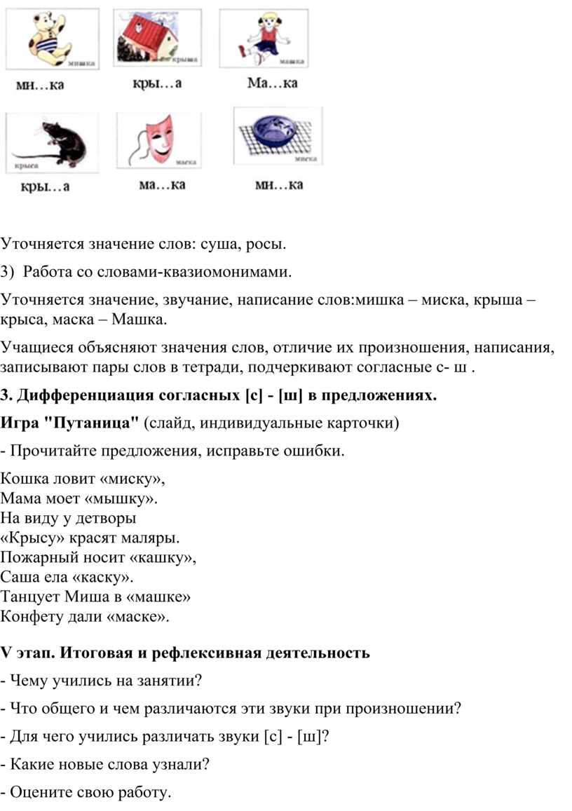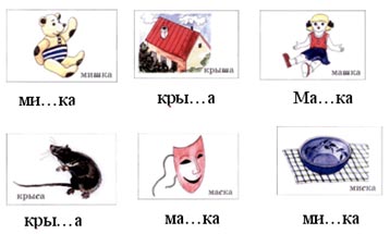 Уточняется значение, звучание, написание слов:мишка – миска, крыша – крыса, маска – Машка.