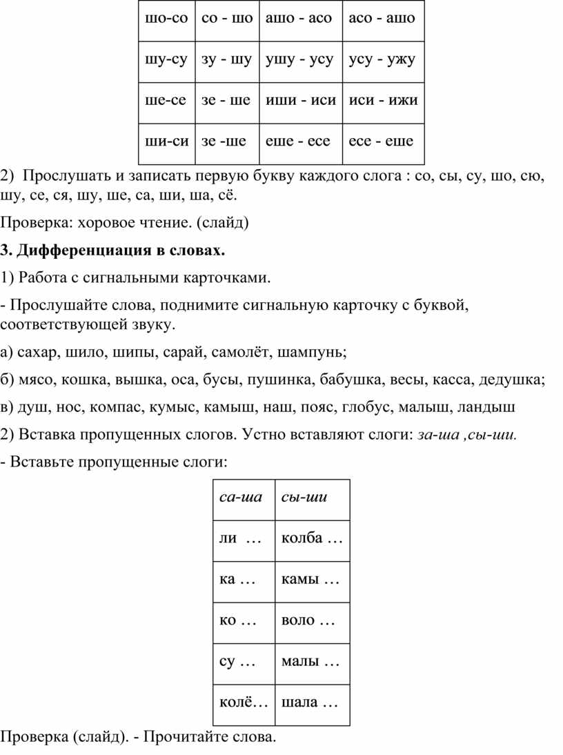 2) Вставка пропущенных слогов. Устно вставляют слоги: за-ша ,сы-ши.