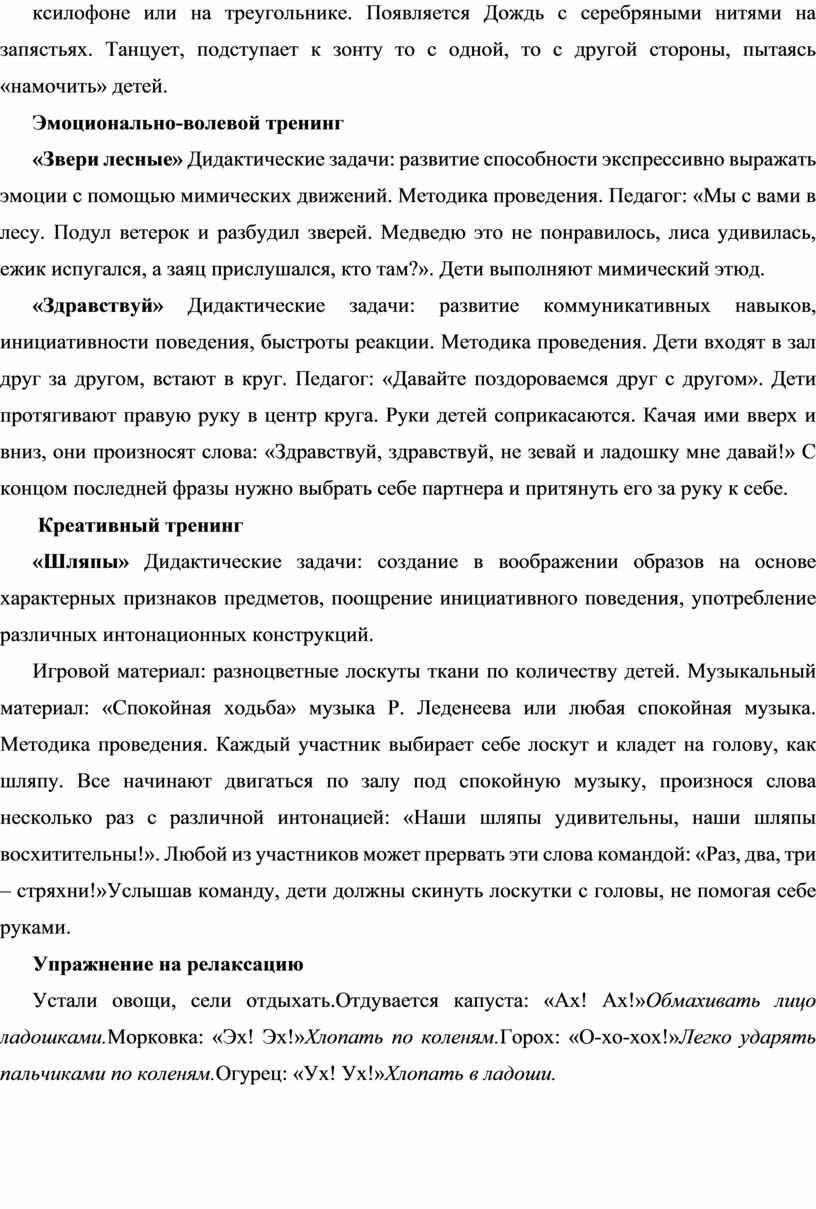«Солнышко и дождик» Дидактические задачи: развитие координации движений, пластики, голосового диапазона. Игровой материал: музыкальные инструменты (ксилофон, металлофон, треугольник), зонт, серебряные нити.