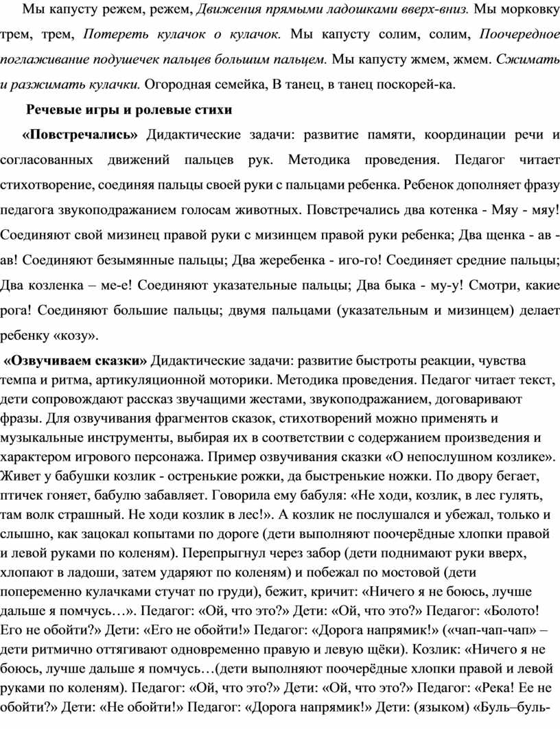 «Повстречались» Дидактические задачи: развитие памяти, координации речи и согласованных движений пальцев рук. Методика проведения. Педагог читает стихотворение, соединяя пальцы своей руки с пальцами ребенка. Ребенок дополняет фразу педагога звукоподражанием голосам животных. Повстречались два котенка - Мяу - мяу! Соединяют свой мизинец правой руки с мизинцем правой руки ребенка; Два щенка - ав - ав! Соединяют безымянные пальцы; Два жеребенка - иго-го! Соединяет средние пальцы; Два козленка – ме-е! Соединяют указательные пальцы; Два быка - му-у! Смотри, какие рога! Соединяют большие пальцы; двумя пальцами (указательным и мизинцем) делает ребенку «козу».