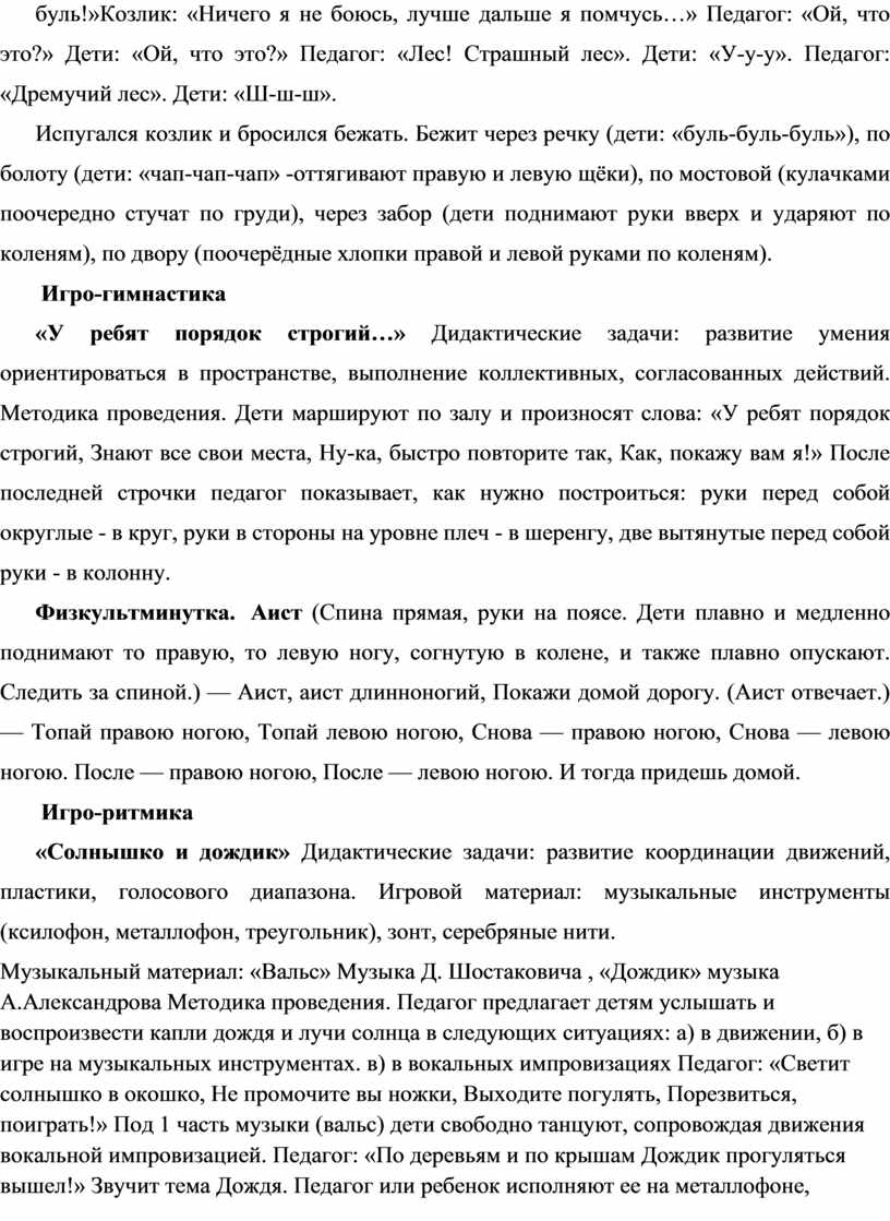 «Озвучиваем сказки» Дидактические задачи: развитие быстроты реакции, чувства темпа и ритма, артикуляционной моторики. Методика проведения. Педагог читает текст, дети сопровождают рассказ звучащими жестами, звукоподражанием, договаривают фразы. Для озвучивания фрагментов сказок, стихотворений можно применять и музыкальные инструменты, выбирая их в соответствии с содержанием произведения и характером игрового персонажа. Пример озвучивания сказки «О непослушном козлике». Живет у бабушки козлик - остренькие рожки, да быстренькие ножки. По двору бегает, птичек гоняет, бабулю забавляет. Говорила ему бабуля: «Не ходи, козлик, в лес гулять, там волк страшный. Не ходи козлик в лес!». А козлик не послушался и убежал, только и слышно, как зацокал копытами по дороге (дети выполняют поочерёдные хлопки правой и левой руками по коленям). Перепрыгнул через забор (дети поднимают руки вверх, хлопают в ладоши, затем ударяют по коленям) и побежал по мостовой (дети попеременно кулачками стучат по груди), бежит, кричит: «Ничего я не боюсь, лучше дальше я помчусь…». Педагог: «Ой, что это?» Дети: «Ой, что это?» Педагог: «Болото! Его не обойти?» Дети: «Его не обойти!» Педагог: «Дорога напрямик!» («чап-чап-чап» – дети ритмично оттягивают одновременно правую и левую щёки). Козлик: «Ничего я не боюсь, лучше дальше я помчусь…(дети выполняют поочерёдные хлопки правой и левой руками по коленям). Педагог: «Ой, что это?» Дети: «Ой, что это?» Педагог: «Река! Ее не обойти?» Дети: «Не обойти!» Педагог: «Дорога напрямик!» Дети: (языком) «Буль–буль-буль!»Козлик: «Ничего я не боюсь, лучше дальше я помчусь…» Педагог: «Ой, что это?» Дети: «Ой, что это?» Педагог: «Лес! Страшный лес». Дети: «У-у-у». Педагог: «Дремучий лес». Дети: «Ш-ш-ш».