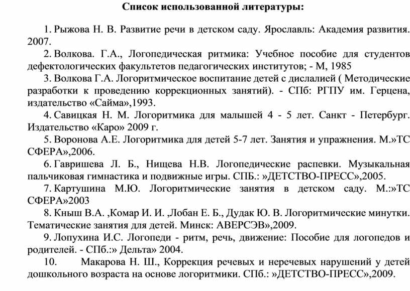 10. Макарова Н. Ш., Коррекция речевых и неречевых нарушений у детей дошкольного возраста на основе логоритмики. СПб.: »ДЕТСТВО-ПРЕСС»,2009.