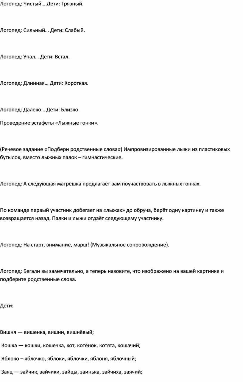 Логопед: Бегали вы замечательно, а теперь назовите, что изображено на вашей картинке и подберите родственные слова.