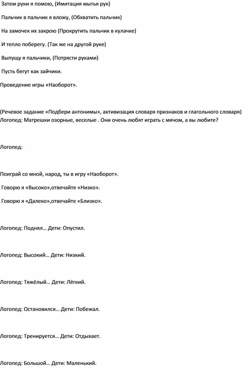 (Речевое задание «Подбери антонимы», активизация словаря признаков и глагольного словаря) Логопед: Матрешки озорные, веселые . Они очень любят играть с мячом, а вы любите?