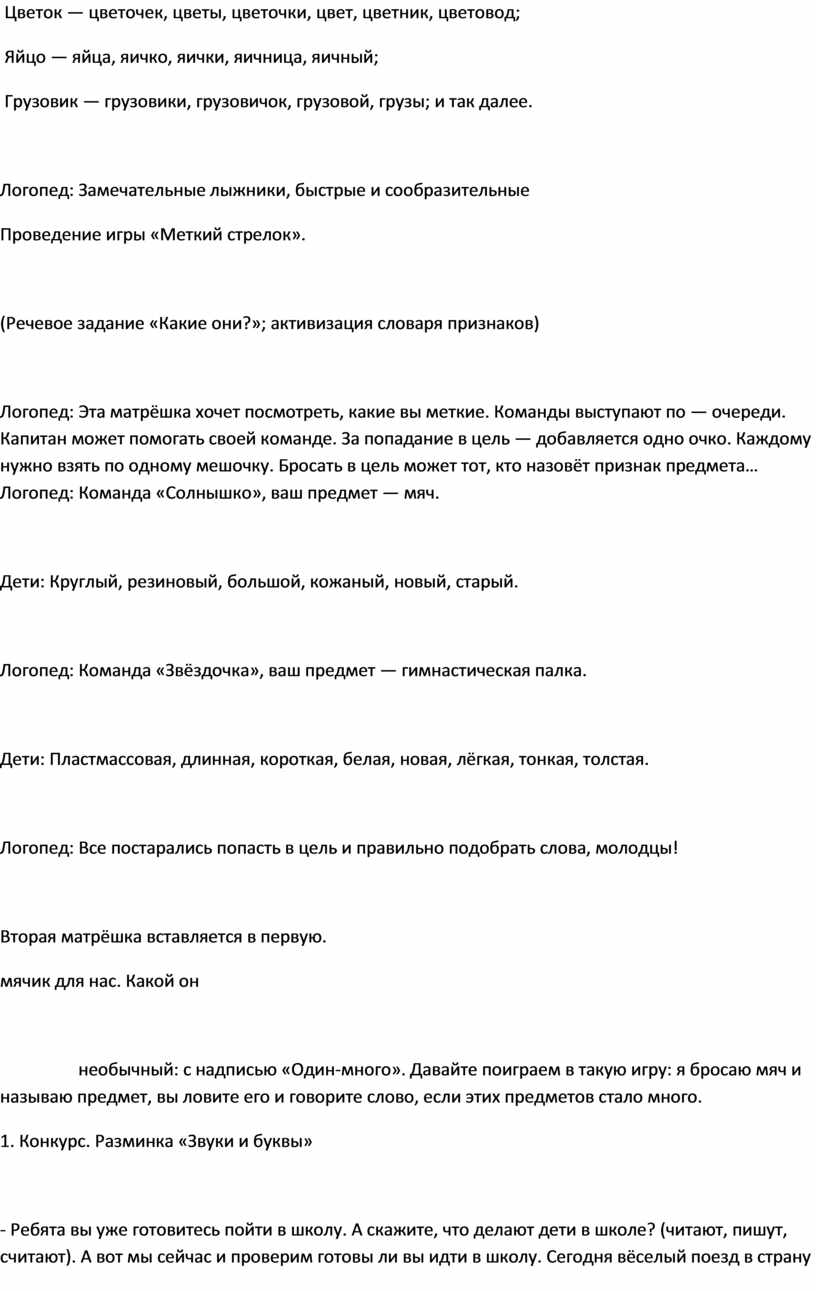 Логопед: Эта матрёшка хочет посмотреть, какие вы меткие. Команды выступают по — очереди. Капитан может помогать своей команде. За попадание в цель — добавляется одно очко. Каждому нужно взять по одному мешочку. Бросать в цель может тот, кто назовёт признак предмета… Логопед: Команда «Солнышко», ваш предмет — мяч.