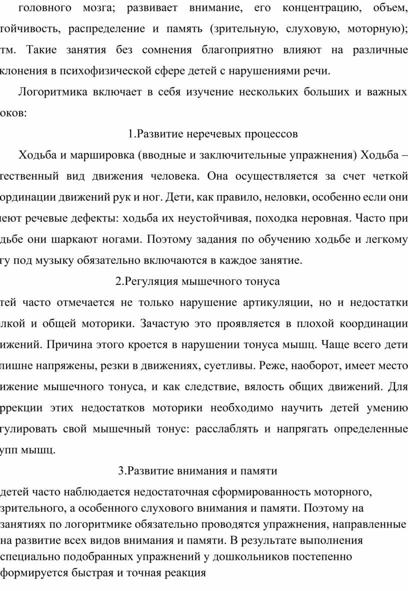 · детей часто наблюдается недостаточная сформированность моторного, зрительного, а особенного слухового внимания и памяти. Поэтому на занятиях по логоритмике обязательно проводятся упражнения, направленные на развитие всех видов внимания и памяти. В результате выполнения специально подобранных упражнений у дошкольников постепенно формируется быстрая и точная реакция на различные виды раздражителей. Дети учатся сосредотачиваться, прилагая для этого определенные волевые усилия. Улучшается не только устойчивость, но и переключаемость внимания – способность переходить от одного действия к другому. Параллельно с развитием всех параметров произвольного внимания у детей постепенно улучшается память, как моторная, так и зрительная и слуховая.