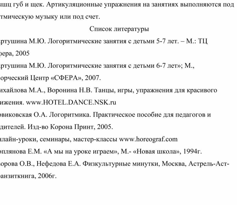 1. Картушина М.Ю. Логоритмические занятия с детьми 5-7 лет. – М.: ТЦ Сфера, 2005