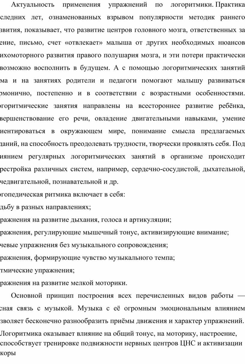 Актуальность применения упражнений по логоритмики. Практика последних лет, ознаменованных взрывом популярности методик раннего развития, показывает, что развитие центров головного мозга, ответственных за чтение, письмо, счет «отвлекает» малыша от других необходимых нюансов психомоторного развития правого полушария мозга, и эти потери практически невозможно восполнить в будущем. А с помощью логоритмических занятий дома и на занятиях родители и педагоги помогают малышу развиваться гармонично, постепенно и в соответствии с возрастными особенностями. Логоритмические занятия направлены на всестороннее развитие ребёнка, совершенствование его речи, овладение двигательными навыками, умение ориентироваться в окружающем мире, понимание смысла предлагаемых заданий, на способность преодолевать трудности, творчески проявлять себя. Под влиянием регулярных логоритмических занятий в организме происходит перестройка различных систем, например, сердечно-сосудистой, дыхательной, речедвигательной, познавательной и др.