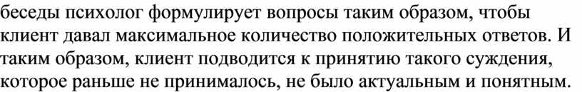 Задача данного приёма – вовлечение клиента в сотрудничество и расширение сферы его сознания. Во время беседы психолог формулирует вопросы таким образом, чтобы клиент давал максимальное количество положительных ответов. И таким образом, клиент подводится к принятию такого суждения, которое раньше не принималось, не было актуальным и понятным.