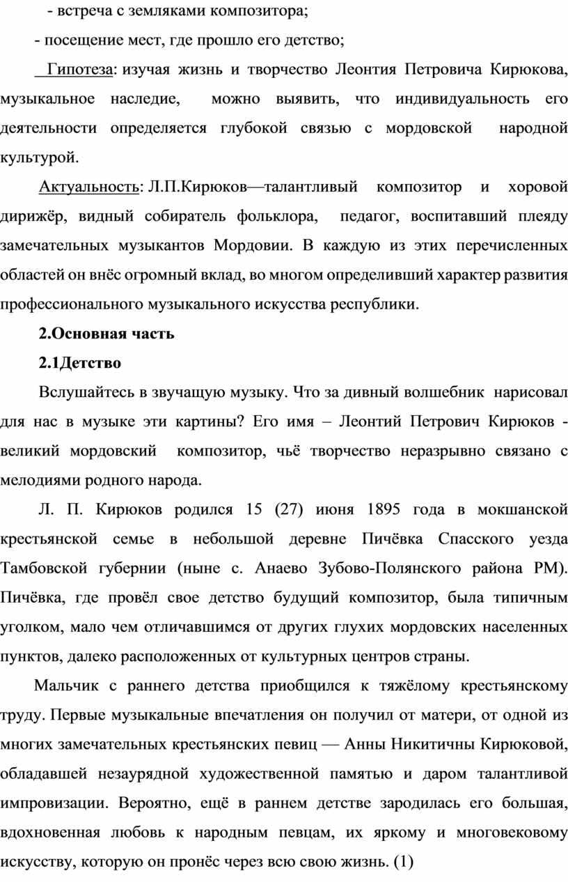 Гипотеза: изучая жизнь и творчество Леонтия Петровича Кирюкова, музыкальное наследие, можно выявить, что индивидуальность его деятельности определяется глубокой связью с мордовской народной культурой.