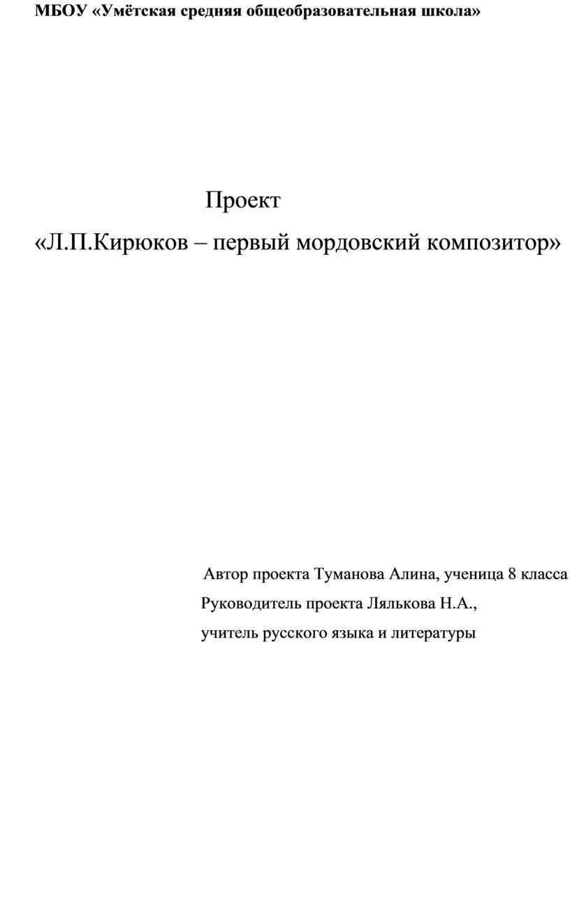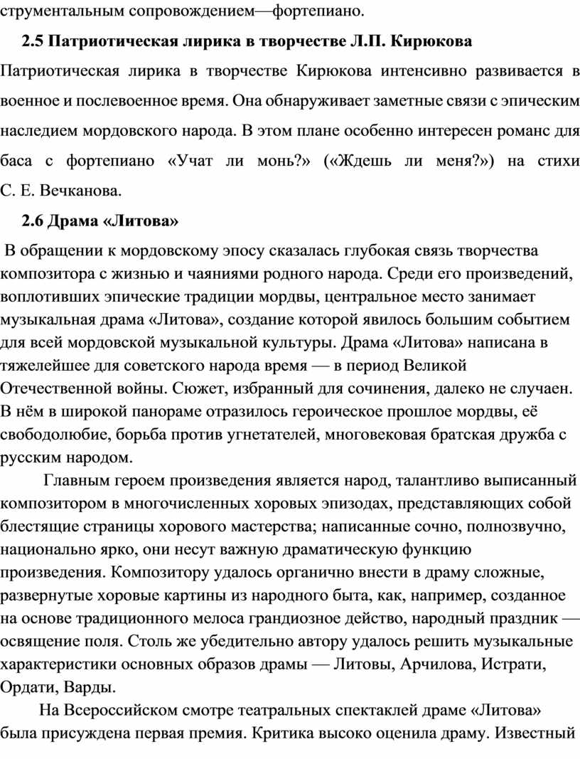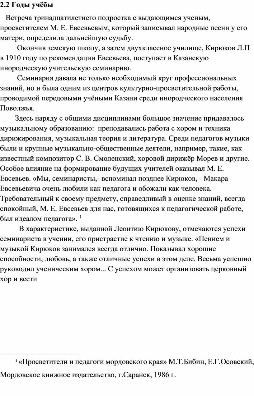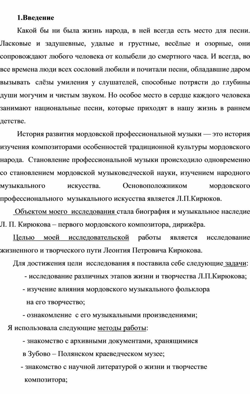 Объектом моего исследования стала биография и музыкальное наследие Л. П. Кирюкова – первого мордовского композитора, дирижёра.