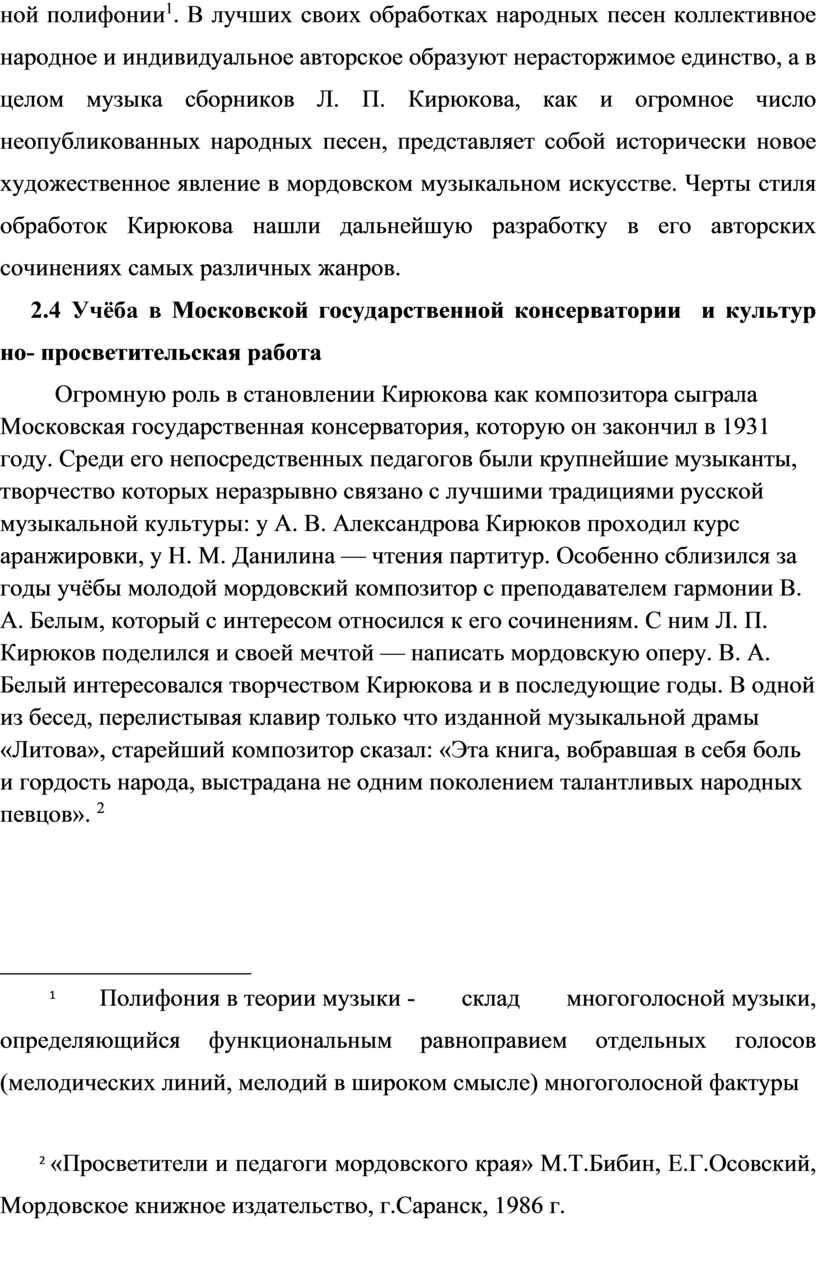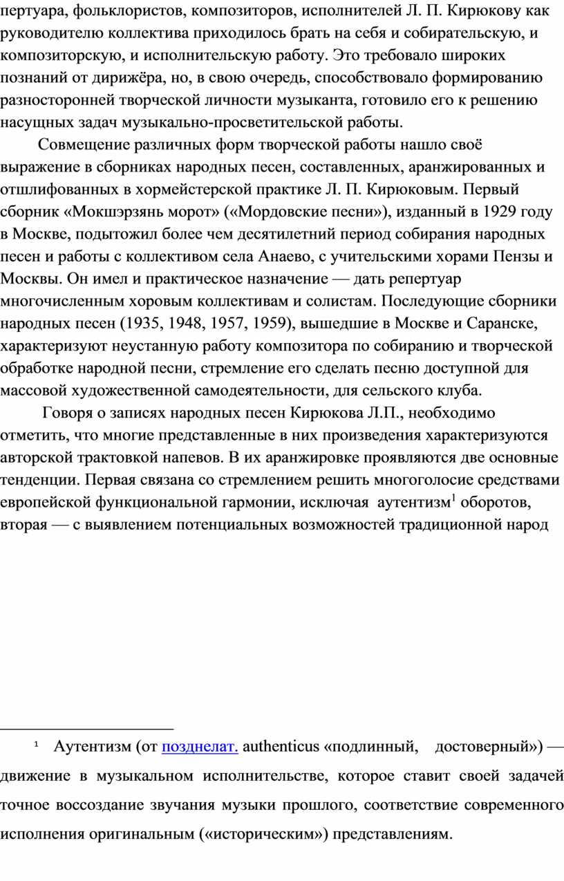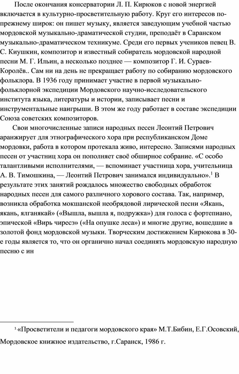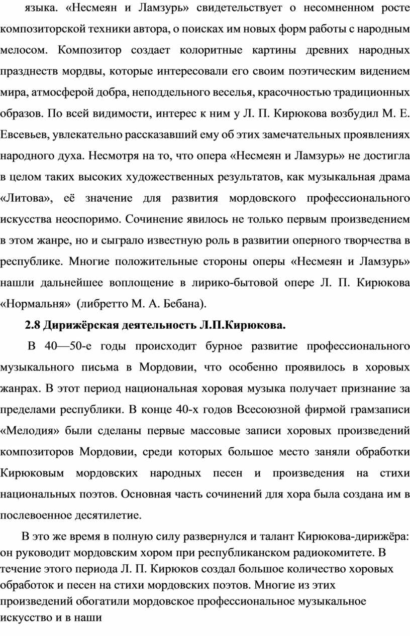Актуальность: Л.П.Кирюков—талантливый композитор и хоровой дирижёр, видный собиратель фольклора, педагог, воспитавший плеяду замечательных музыкантов Мордовии. В каждую из этих перечисленных областей он внёс огромный вклад, во многом определивший характер развития профессионального музыкального искусства республики.