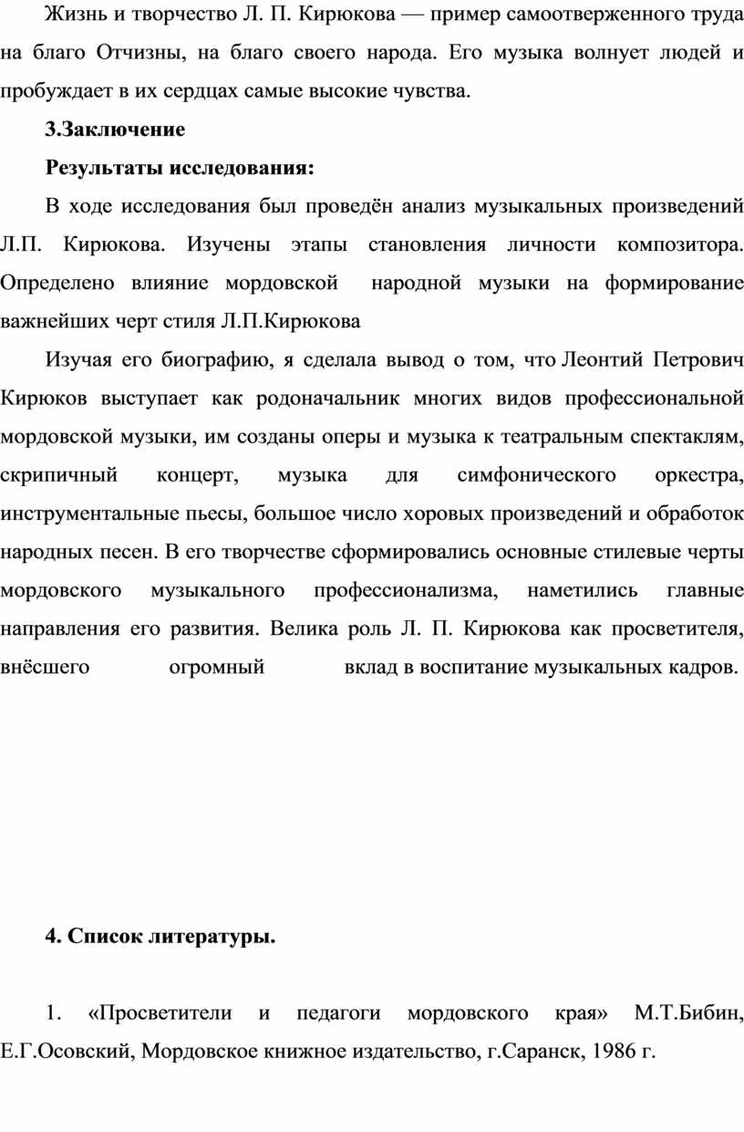 В ходе исследования был проведён анализ музыкальных произведений Л.П. Кирюкова. Изучены этапы становления личности композитора. Определено влияние мордовской народной музыки на формирование важнейших черт стиля Л.П.Кирюкова
