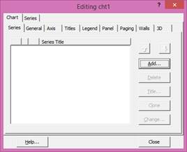 3. Заходим в редактор графиков двойным нажатием на компонент. Редактируем и настраиваем внешний вид Series. Для этого нажимаем Add и выбираем тип графика Line и жмем ОК. Для смены заголовка, нажать Title и ввести формулу y=10*sin(x).