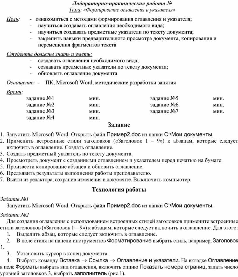 Цель: - ознакомиться с методами формирования оглавления и указателя;