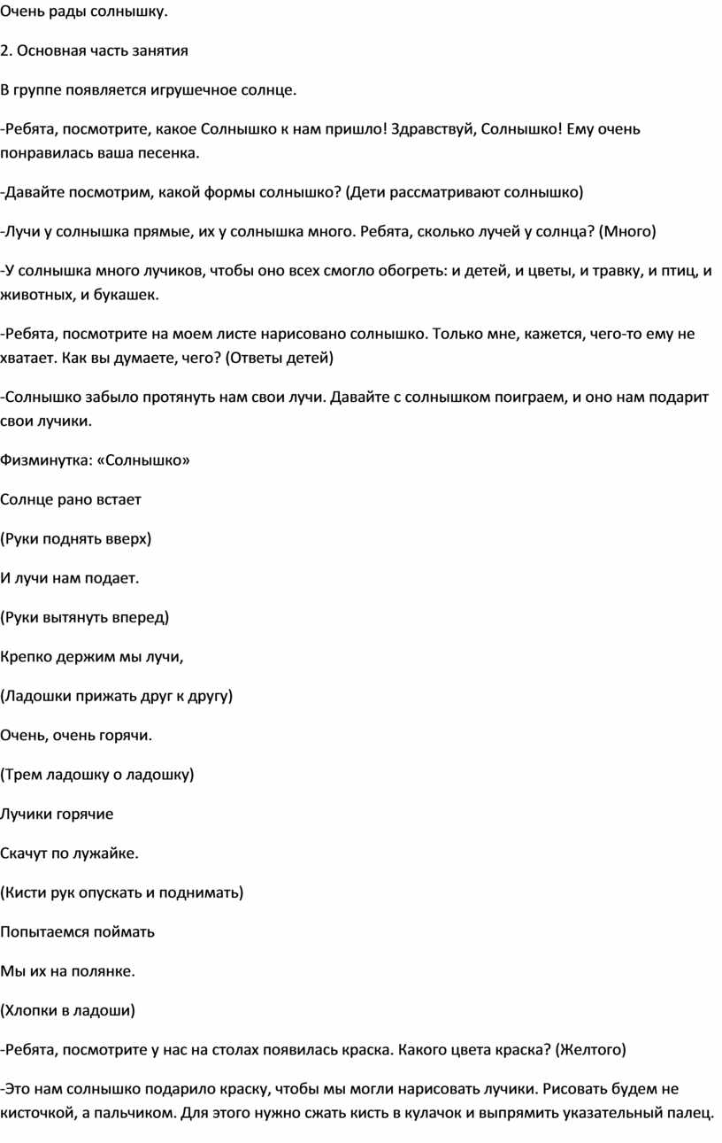 -Ребята, посмотрите на моем листе нарисовано солнышко. Только мне, кажется, чего-то ему не хватает. Как вы думаете, чего? (Ответы детей)